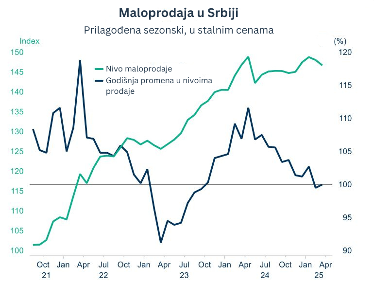 Gore navedena umanjena mobilnost u fokus stavlja još jedan ključni kanal preko kog građanski nemiri utiču na privredu regiona: potrošačko poverenje i otpornost sektora maloprodaje. Zatvaranje lokalnih firmi i prepreke mobilnosti su osetno umanjile potrošačko poverenje. Na sličan način, sektor maloprodaje se suočava sa sopstvenim izazovima. U martu 2025. godine u Srbiji je zabeležen prvi pad u maloprodajnom sektoru još od 2023. Istini za volju, sektor maloprodaje je počeo postepeno da posustaje mnogo pre izbijanja građanskih protesta zbog čega je jako teško odrediti tačnu meru njihovog uticaja na pomenuti sektor. Iako se dobar deo odložene potrošnje može naknadno ostvariti, oni delovi maloprodajnog sektora koji u velikoj meri zavise od spontane kupovine nailaze na ozbiljne prepreke.