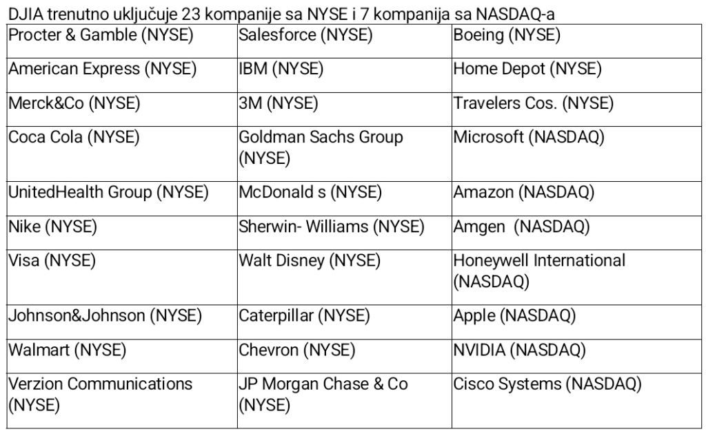 Više od polovine akcija sa liste se nije menjalo u poslednjih 20 godina. Najznačajnija promena na listi desila se juna 2018. godine kada je sa liste isključena akcija kompanije General Electric-a, jedine kompanije koja se do tada zadržala još od originalne liste iz 1896. godine. Trenutno, Procter & Gamble je novi rekorder u tom smislu, jer se akcija ove kompanije koristi za izračunavanje DJIA od 1932. godine.