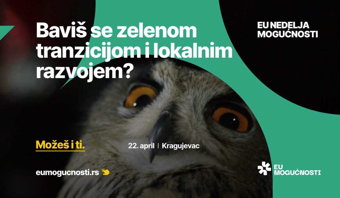 EU nedelja mogućnosti po prvi put dolazi u Kragujevac. U sredu, 22. aprila, u hotelu Kragujevac, građani i predstavnici institucija moći će da se upoznaju sa detaljima poziva u oblastima lokalnog razvoja i zelene tranzicije.