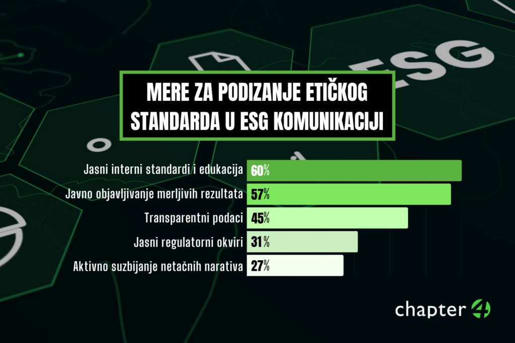 Sve češće se javlja i greenhushing – izbegavanje komunikacije o ESG aktivnostima zbog straha od kritike – koji delimično prepoznaju i naši ispitanici. Ovaj fenomen dodatno komplikuje komunikaciju, jer pokazuje da organizacije balansiraju između potrebe za transparentnošću i straha od reputacionog rizika.
