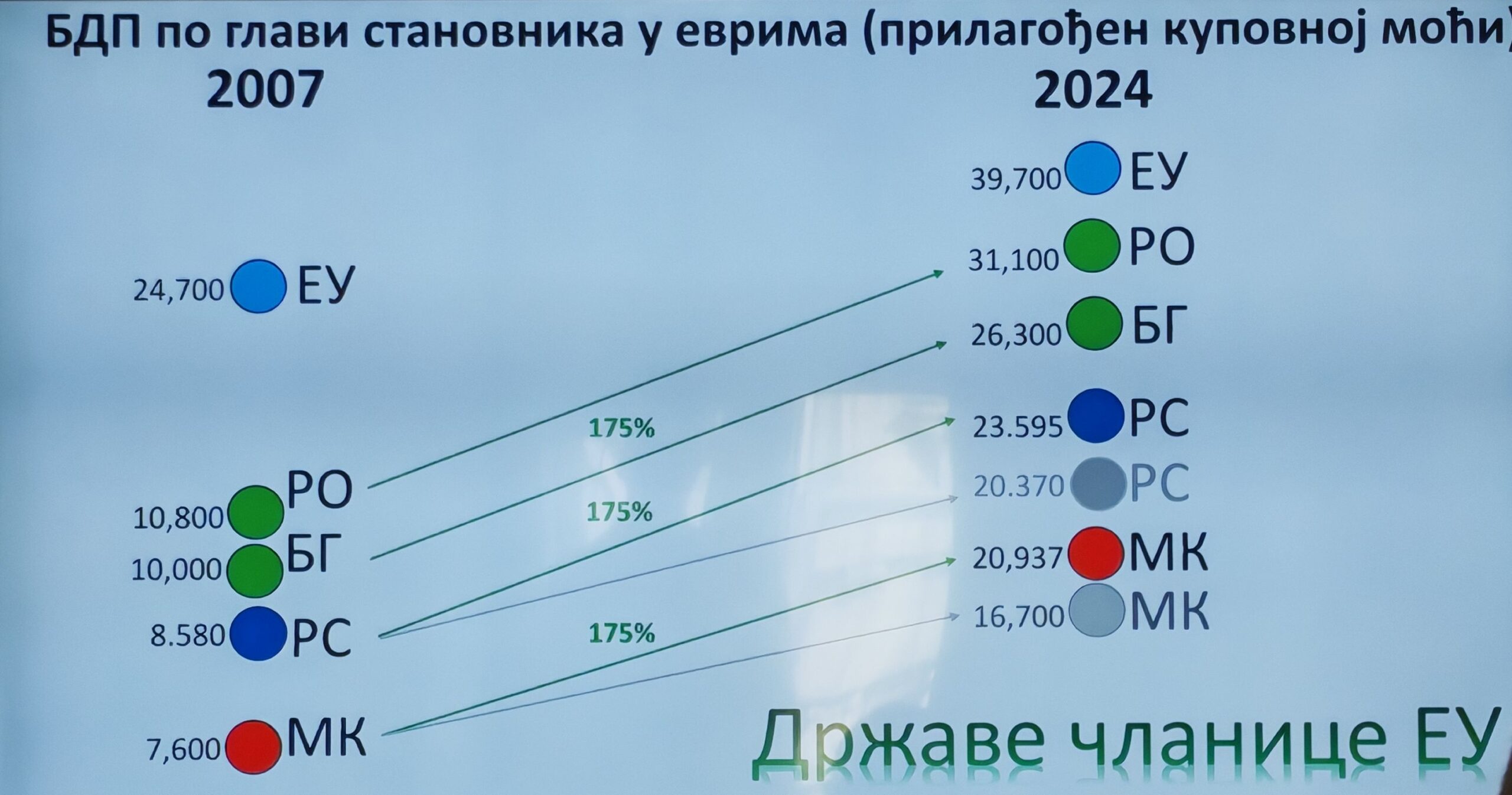 Da članstvo u Evropskoj uniji može imati veoma pozitivan uticaj na životni standard pokazuju primeri iz našeg okruženja kao što su Bugarska i Rumunija, ali i projekcije rasta BDP-a po glavi stanovnika prilagođene kupovnoj moći. Te projekcije predstavio je Viktor Mitevski, izvršni direktor makedonske Asocijacije za istraživanje i razvoj ZMAI.